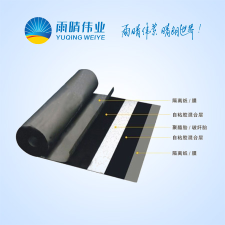 自粘聚合物改性瀝青防水卷材是采用聚酯氈為胎基,兩面涂彈性體(SBS)改性瀝青,上表面覆聚乙烯膜、細(xì)砂或礦物粒料等隔離材料,下表面條涂自粘橡膠瀝青,并附可剝離的涂硅隔離膜或涂硅皺紋隔離紙作為隔離材料制成的一種自粘防水卷材。